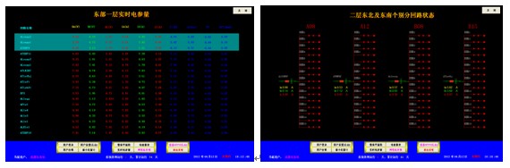 登陸普通權限用戶,通過主界面的操作,即可以查看各個區域運行的電參量(電流、電壓、有功、無功、功率因數、電度、),對各個回路的分合閘狀態通過回路數據顏色變化來顯示出來(紅色代表合閘、綠色代表分閘)。同時各個回路都支持曲線查詢功能,通過該界面的操作即可查詢每一路的電流趨勢曲線。