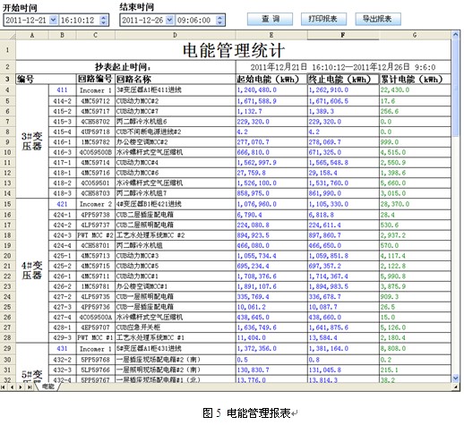 系統采集的有功電度數據,按照回路名稱的不同,自動生成日報表、月報表和年報表并有報表打印功能,并可對某一回路的某一時間段內的用電量進行查詢與打印,同時這些報表也能以Excel的格式導出。如圖5所示。