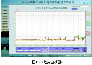 負荷趨勢曲線界面中可直觀的查看回路的負荷運行情況。查看實時和歷史趨勢曲線,點擊畫面相應按鈕或菜單項可以完成相應功能的切換;幫助用戶進線趨勢分析和故障追憶,具備曲線打印功能。為分析整個系統的運行狀況提供了直觀而方便的軟件支持。見圖(9)。