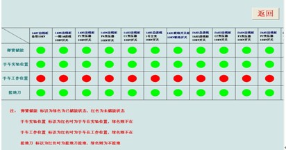 顯示高壓各回路遙信狀態,通過畫面顏色的變化(紅色表示合閘狀態、綠色表示分閘狀態、灰色表示手車分離狀態)可以看到現場斷路器運行狀態、手車位置、接地刀閘狀態、彈簧儲能狀態等。
