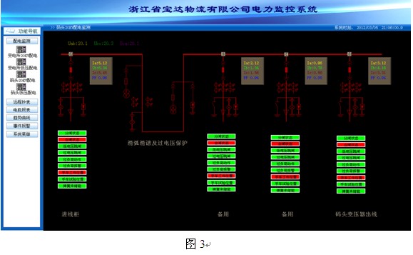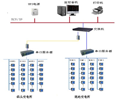 整套電力監控系統監控管理部分包括監控管理主機、打印機、UPS電源等;該配電系統分成兩個部分:碼頭變電所及陸地變電所,電力監控管理部分設于陸地變電所總降站值班室。對于陸地變電所所有高低壓配電設備監控儀表均可通過485總線接入通訊管理機,并由通訊管理機直接接入電力監控通訊機柜內的網絡交換機,最終接入監控管理主機;對于碼頭變電所,距離電力監控值班室有 600米左右距離,因此在碼頭變電所設置通訊采集箱,所有碼頭變電所高低壓配電設備監控儀表均通過485總線接入通訊采集箱內通訊管理機,并由光電轉換等設備將信號通過光釬傳輸至電力監控值班室內電力監控通訊機柜,最終經過以太網交換機接入至監控管理主機。在本項目中通訊系統包括通訊管理機、屏蔽雙絞線、光纖、光電轉換等;數據采集單元主要包括微機綜合保護裝置、ACR網絡多功能儀表。