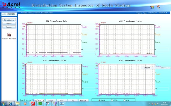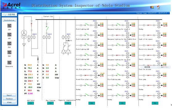 體育場(chǎng)的主要用電負(fù)荷為照明和應(yīng)急照明,約占到總負(fù)載的70%,其中以金鹵燈為主的場(chǎng)地照明占到照明負(fù)荷的60%。除照明外最大的負(fù)荷是電子大屏。援贊比亞恩多拉體育場(chǎng)電力監(jiān)控系統(tǒng)為Acrel-2000型。本系統(tǒng)涉及回路共112個(gè),配電柜上安裝的儀表為上海安科瑞ACR系列及PZ系列多功能電力儀表。