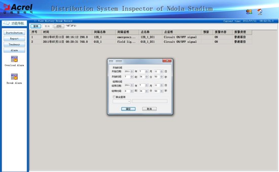 根據(jù)本系統(tǒng)的設(shè)計(jì)意圖,如果重要回路或者照明回路三相中某一相電流負(fù)荷超過額定值的90%,系統(tǒng)必須立刻發(fā)出聲光報(bào)警并彈出指示框指明報(bào)警源,提醒管理人員注意負(fù)載的三相平衡和負(fù)載率;根據(jù)現(xiàn)場(chǎng)技術(shù)人員要求,追求當(dāng)某一個(gè)低壓配電回路斷路器發(fā)生變位時(shí),同樣發(fā)出聲光報(bào)警和彈出報(bào)警框指明報(bào)警源的功能。報(bào)警記錄存于數(shù)據(jù)庫中,保存3年,用戶可以通過查詢功能查看指定時(shí)間域內(nèi)發(fā)生的所有報(bào)警信息。