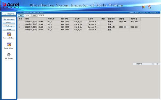 電力監(jiān)控系統(tǒng)為整個(gè)體育場(chǎng)低壓配電系統(tǒng)運(yùn)行狀態(tài)的監(jiān)測(cè)提供了一套完整的解決方案,通過計(jì)算機(jī)界面反映給值班員和系統(tǒng)管理人員。系統(tǒng)軟件采用全英文界面,通過界面左側(cè)的樹形按鍵菜單進(jìn)行畫面切換操作。其中報(bào)警功能只對(duì)中國(guó)留守人員開放,故該功能界面設(shè)定成中文。本系統(tǒng)的具體功能如下: