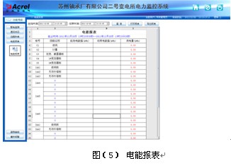 用電量報表功能,可選擇時間段進行查詢,支持任意時間段電度累計查詢,具備數據導出和報表打印等功能。為值班人員提供了精確可靠的電能報表。該報表各回路名稱和數據庫關聯,方便用戶修改回路名稱。見圖( 5)。