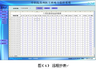 遠程抄表功能,主要完成對變壓器進線電參數(shù)查詢。支持任意時刻段電參數(shù)查詢,具備數(shù)據(jù)導出和報表打印等功能。該報表查詢供變電所4臺變壓器進線的電參數(shù),主要包括:三相相電壓、三相線電壓、三相電流、有功功率、無功功率、視在功率、功率因數(shù)、頻率和有功電度。見圖(4)。
