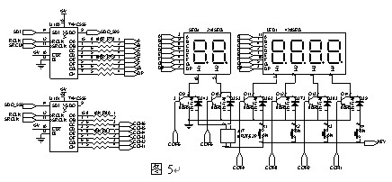 顯示部分電路使用串入并出移位寄存器74HC595兩顆級聯使用,其中U100的輸出作為數碼管的段碼,U101輸出作為數碼管的位選信號,使用動態顯示方式,逐個點亮數碼管,數碼管的位選信號還作為按鍵的檢測功能,CPU在“KEY”線輸出電平,當某一位數碼管導通,如果此時接在此數碼管選通線上的按鍵按下時,“KEY”線會被拉低,CPU就會檢測到一次按鍵事件,再經過按鍵消抖處理來防止多次觸發或誤判。(圖5)