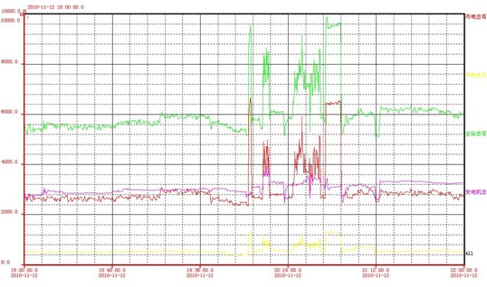 由于開幕式當晚對配電系統安全性要求極高,因此,在重要回路部分采用現場發電,保證配電系統運行安全,穩定。圖(四)中,大紅色曲線表示由廣州市供電局供電功率趨勢曲線,紫色部分為現場發電機發電功率趨勢,綠色曲線表示當前總功率運行趨勢,通過實時趨勢曲線,可以幫助值班人員密切監視當前負荷運行狀況。