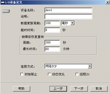 設(shè)備驅(qū)動(dòng)組態(tài): 首先,在紫金橋開(kāi)發(fā)系統(tǒng)的“數(shù)據(jù)庫(kù)”選項(xiàng)卡中,展開(kāi)節(jié)點(diǎn)“設(shè)備驅(qū)動(dòng)-〉PLC-〉Panasonic(松下)”,然后雙擊“DLU-MEWTOCOL/TCP(FP系列..)”,在彈出的“I/O設(shè)備定義”對(duì)話框中填寫(xiě)基本的設(shè)備通訊參數(shù),如下圖: