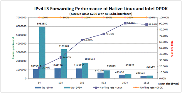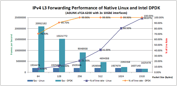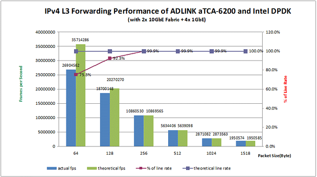 此外,Intel® DPDK還提供了一種方法,即可以設(shè)置每個(gè)執(zhí)行單元運(yùn)行在每一個(gè)核心上,以維持更多的Core Affinity,從而避免緩存丟失。在此白皮書(shū)描述的測(cè)試中,aTCA-6200處理器刀片的物理端口根據(jù)Affinity被綁定在兩個(gè)不同的CPU線程上。