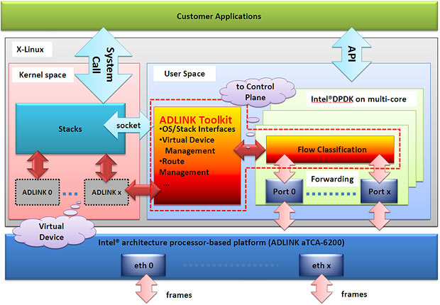 相比之下,Intel® DPDK在自己保留的內(nèi)存區(qū)域接收數(shù)據(jù)包,這個(gè)區(qū)域位于用戶空間(User Space)緩沖區(qū),之后根據(jù)配置規(guī)則將這些數(shù)據(jù)包分類到每一個(gè)Flow中。在處理完解封包之后,在相同的用戶空間(User Space)緩沖區(qū)中使用正確的報(bào)頭進(jìn)行包封裝,最后通過(guò)相關(guān)的物理端口發(fā)送這些數(shù)據(jù)。