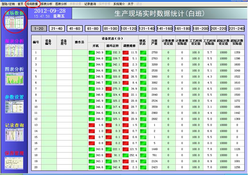 界面顯示每一臺設備的基本信息:編號(固定)、設備編號、設備型號、操作員;狀態:開機、循環運轉、調整維修、鎖機狀態;數據:開機時間、循環運轉時間、調整維修時間、當班產量、計數修整設定值(預留)、計數修整實際值、工藝時間設定值、工藝時間實際值、超標次數設定值、超標次數實際值。