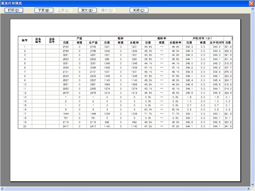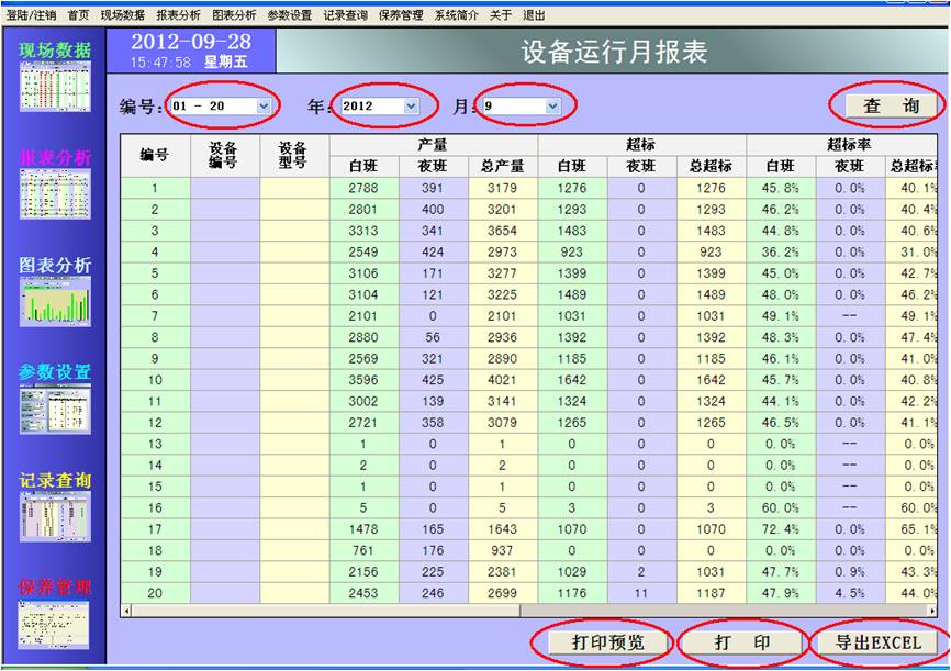 監控系統可以為生產全過程的數據產生日報表和月報表,按設備和班次統計產量、超標、超標率、開機時間、運行時間、開機率和運行率。