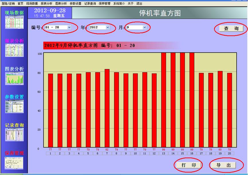 停機率直方圖通過選擇編號、年、月,然后點擊“查詢”按鈕進行查詢,按編號統計的設備停機率直方圖即顯示在下方: