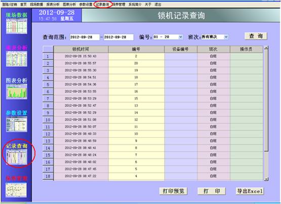 輸入查詢的日期范圍、編號、班次,然后點擊“查詢”按鈕,鎖機的相關記錄集即按照鎖機發生時間的倒序排列。