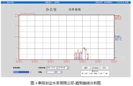 系統提供了實時曲線和歷史趨勢兩種曲線分析接口,通過調用相關回路實時曲線接口分析該回路當前的負荷運行狀況。如通過調用某配出回路的實時曲線可分析該回路的電氣設備所引起的信號波動情況。系統的歷史趨勢即系統對所有已存儲數據均可查看其歷史趨勢,方便工程人員對監測的配電網絡進行質量分析。