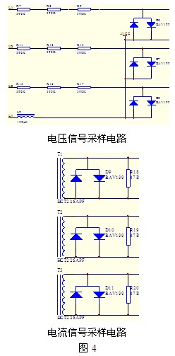 基于成本、內部空間和0.5 級精度設計的綜合考慮,電壓信號采樣選用電阻網絡分壓的方式,電流信號采樣選用電流互感器加電阻取樣的方式,并都采用二極管 BAV199 作箝位保護,其原理如圖 4 所示。