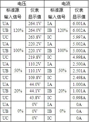 給儀表輸入額定值為 AC220V 、 5A 的信號。電壓、電流實驗數據如下(實驗儀器為南京丹迪克 DK-34B1 交流采樣變送器校驗裝置):