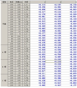 電能實驗數據如下 (實驗儀器為 PTC 三相便攜式電能表檢驗裝置、 HC-3100 三相標準電能表) :