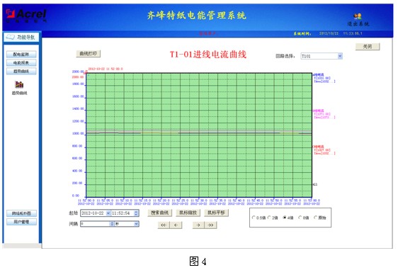 各重要回路電流、功率實時趨勢顯示及歷史趨勢查詢功能。選擇回路后,該回路實時趨勢曲線會不斷刷新,選擇“起始時間”可查看該回路歷史趨勢曲線,選擇“時間長度”可查看歷史日、月、年趨勢曲線,能更加直觀反映該回路運行情況,如下圖4: