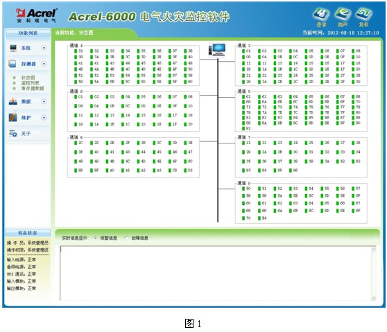 Acrel-6000電氣火災(zāi)監(jiān)控系統(tǒng)是本公司自主研發(fā)的用于接收剩余電流式電氣火災(zāi)探測器等現(xiàn)場設(shè)備信號,以實(shí)現(xiàn)對被保護(hù)電氣線路的報警、監(jiān)視、控制、管理的運(yùn)行于計算機(jī)的工業(yè)級硬件/軟件系統(tǒng)。本系統(tǒng)應(yīng)用于大型商場、生活小區(qū)、生產(chǎn)基礎(chǔ)、辦公大樓、商場酒店等區(qū)域的消防控制中心,對分散在建筑內(nèi)的探測器進(jìn)行遙測、遙調(diào)、遙控、遙信,方便實(shí)現(xiàn)監(jiān)控與管理。本系統(tǒng)采用標(biāo)準(zhǔn)的Modbus現(xiàn)場總線將具有通信功能的探測器相互連接起來,當(dāng)現(xiàn)場保護(hù)線路中的被探測參數(shù)超過報警設(shè)定值時,能發(fā)出報警信號、控制信號,能指示報警部位并保存報警信息。
