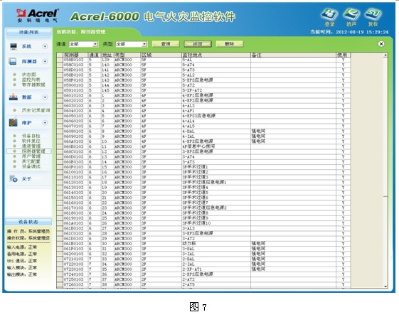 該管理功能只有“系統(tǒng)管理級”可進(jìn)行操作,“系統(tǒng)管理級”權(quán)限登錄系統(tǒng)后,通過點(diǎn)擊【維護(hù)】菜單下的“探測器管理”可進(jìn)入如下圖所示的探測器管理界面。該界面可修改各通道所對應(yīng)的通訊端口、通訊速率及使用狀態(tài),軟件界面如圖7所示: