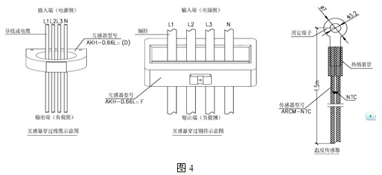 3)剩余電流和溫度傳感器穿線示意圖。剩余電流互感器的額定電流等級,應(yīng)大于或等于配電回路保護(hù)電器的整定電流值,實(shí)際應(yīng)用中應(yīng)確保所有線纜或銅排穿過互感器;.溫度傳感器為一熱敏電阻NTC,它提供-10℃-120℃的溫度監(jiān)控基準(zhǔn),可以用來監(jiān)測線纜或配電箱內(nèi)的溫度,提供溫度保護(hù),如圖4所示