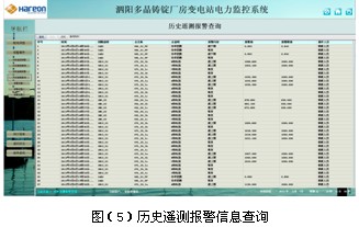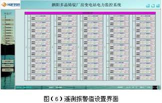 遙信和遙測報警功能,主要完成對低壓各出線回路的開關運行狀態和負載進線監控,對開關變位和負載越限彈出報警界面指示具體的報警位置并聲音報警,提醒值班人員及時處理。遙測報警值設置界面可以看到每個監控點的實時值和報警設置值,方便值班人員比對進線設置,負載越限值在相應權限下可自由設置。具備歷史查詢功能。見圖(4)至圖(6)。