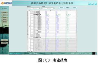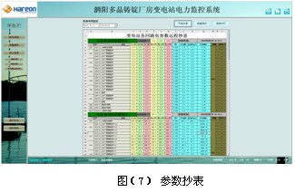 參數抄表功能,主要對低壓各出線回路的電參數進線查詢。支持任意時刻電參數查詢,具備數據導出和報表打印等功能。該報表查詢供變電所內6臺變壓器出線各低壓回路的電參數,主要包括:三相電流、有功功率和有功電度及變壓器溫度。該報表各回路名稱和數據庫關聯,方便用戶修改回路名稱。見圖(7)。