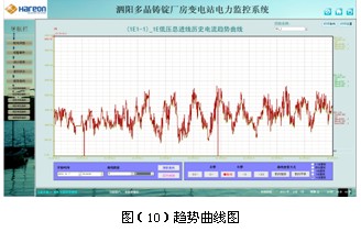 負荷趨勢曲線界面中可直觀的查看回路的負荷運行情況。查看實時和歷史趨勢曲線,點擊畫面相應按鈕或菜單項可以完成相應功能的切換;幫助用戶進線趨勢分析和故障追憶,具備曲線打印功能。為分析整個系統的運行狀況提供了直觀而方便的軟件支持。見圖(10)。