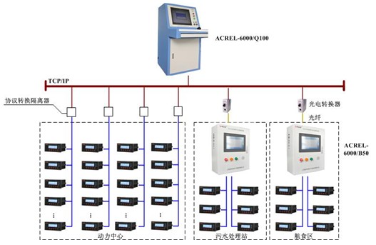 本工程共分為 3 個(gè)監(jiān)控區(qū)域,分別為航食區(qū)、污水處理站以及動(dòng)力中心。其中航食區(qū)及污水處理站現(xiàn)場(chǎng)監(jiān)測(cè)回路較少,分別為 24 及 38 個(gè)監(jiān)控回路,動(dòng)力中心共計(jì) 96 個(gè)監(jiān)控回路,本工程在配電柜現(xiàn)場(chǎng)均安裝 ARCM200 系列剩余電流監(jiān)控探測(cè)器及 AKH-0.66/L 型剩余電流互感器。在航食區(qū)及污水處理站管理層配置 AcrelAcrel-6000/B50 壁掛式電氣火災(zāi)監(jiān)控系統(tǒng);在動(dòng)力中心設(shè)立琴臺(tái)式電氣火災(zāi)監(jiān)控系統(tǒng) Acrel-6000/Q100 。三個(gè)電氣火災(zāi)監(jiān)控系統(tǒng)在地理上分布于三個(gè)管理區(qū)域,每套系統(tǒng)又通過(guò)局域網(wǎng)組成一個(gè)有機(jī)的整體,將各處的漏電及溫度信息進(jìn)行共享,便于機(jī)場(chǎng)工作人員進(jìn)行統(tǒng)一管理。