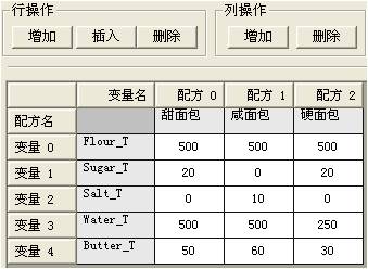這里以一個面包加工的工藝為例,針對不同類型的面包,配置面粉,白糖,食鹽,水,黃油的含量,要實現(xiàn)的配方功能如下: