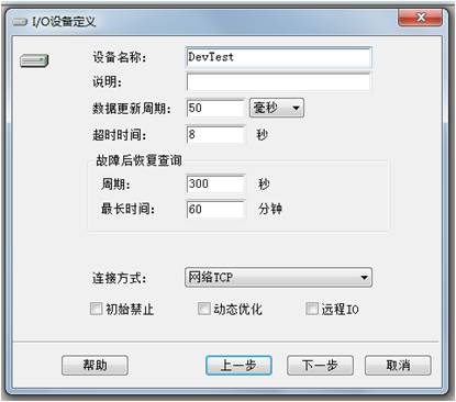 再建設備時,用專門為此開發的驅動,設備定義對話框處將不在出現設備地址的文本框,而連接方式也變成了網絡TCP。設備定義處的IP地址,填寫連接各設備的網關IP地址,端口號要設置成和配置軟件中設置的一致。至此完成了設備的組態。