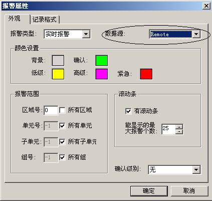 注意數據源中選擇的遠程數據源Remote,報警范圍中選擇的是區域0。這樣該報警顯示的將是遠程數據源Remote的區域0的報警。運行結果如下: