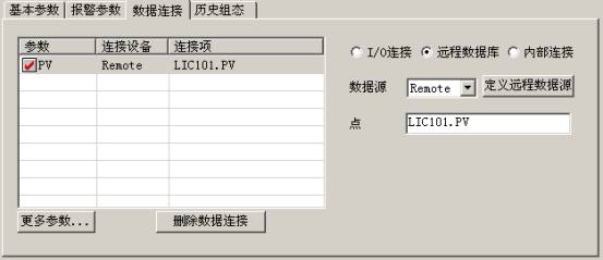 數據源就是要連接的遠程的數據服務器,點是遠程數據庫的點參數。這樣連接完成之后,當前選中的點參數(如LIC110.PV)就與遠程數據庫的指定點參數相對應了。這時在本地數據庫中就可以使用該點參數(LIC110.PV)進行控制、運算,它等同于遠程數據庫的LIC101.PV。