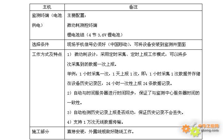 2.5通訊網(wǎng)絡(luò) 中國(guó)移動(dòng)的GPRS網(wǎng)絡(luò)信號(hào)覆蓋范圍廣、數(shù)據(jù)傳輸速率高、通信質(zhì)量可靠、誤碼率低、運(yùn)行穩(wěn)定、數(shù)據(jù)傳輸實(shí)時(shí)性、安全性和可靠性高、安裝調(diào)試簡(jiǎn)單方便,按信息流量計(jì)費(fèi),用戶(hù)使用成本比較低。 本系統(tǒng)通信網(wǎng)絡(luò)采用中國(guó)移動(dòng)公司GPRS網(wǎng)絡(luò)和Internet公網(wǎng)。要求監(jiān)控中心具備寬帶(類(lèi)型:光纖、網(wǎng)線、ADSL等),并具有一個(gè)Internet網(wǎng)絡(luò)上的固定IP。 監(jiān)測(cè)點(diǎn)測(cè)控終端內(nèi)部配置GPRS無(wú)線數(shù)據(jù)傳輸模塊,模塊內(nèi)安裝一張開(kāi)通GPRS功能的SIM卡。測(cè)控終端通過(guò)其內(nèi)部的GPRS無(wú)線數(shù)據(jù)傳輸模塊與監(jiān)控中心服務(wù)器組成一個(gè)通信網(wǎng)絡(luò),實(shí)現(xiàn)系統(tǒng)的遠(yuǎn)程數(shù)據(jù)傳輸。 網(wǎng)絡(luò)運(yùn)行費(fèi)用: 監(jiān)測(cè)中心:需支付寬帶使用費(fèi)用,具體費(fèi)用標(biāo)準(zhǔn)請(qǐng)?jiān)诋?dāng)?shù)叵嚓P(guān)部門(mén)咨詢(xún)。 監(jiān)測(cè)點(diǎn)現(xiàn)場(chǎng):每個(gè)監(jiān)測(cè)點(diǎn)的SIM卡的通訊費(fèi)用(數(shù)據(jù)通信費(fèi),以河北為例,具體收費(fèi)標(biāo)準(zhǔn)請(qǐng)咨詢(xún)當(dāng)?shù)匾苿?dòng)公司)。 子站:5元/月(30M) 子站每月總通信費(fèi):5*現(xiàn)場(chǎng)監(jiān)測(cè)點(diǎn)數(shù)量 2.6現(xiàn)場(chǎng)監(jiān)測(cè)點(diǎn)水位監(jiān)測(cè)終端 根據(jù)地下水監(jiān)測(cè)現(xiàn)場(chǎng)環(huán)境多樣的特點(diǎn),水位監(jiān)測(cè)終端設(shè)計(jì)了三種供電方式,分別為:市電供電(現(xiàn)場(chǎng)有AC220V電源)、太陽(yáng)能供電和鋰電池組供電。其中市電供電和太陽(yáng)能供電方式能夠滿足數(shù)據(jù)上報(bào)比較頻繁的要求,數(shù)據(jù)上報(bào)要求不頻繁時(shí)可使用鋰電池組供電方式。 2.6.1鋰電池組供電方案 適用于沒(méi)有站房的監(jiān)測(cè)井,內(nèi)置1組鋰電池組作為工作電源,特別適合于沒(méi)有外部電源供電的現(xiàn)場(chǎng)環(huán)境,微功耗設(shè)計(jì),鋰電池組可以正常工作2-5年。 ※注:電池有效壽命為5年,實(shí)際使用壽命大于1萬(wàn)次無(wú)線通訊.