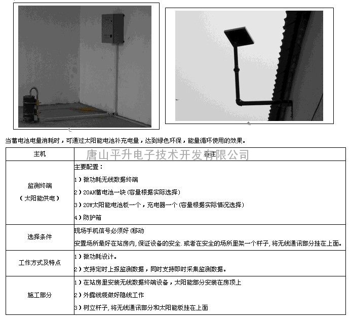 2.6.2太陽(yáng)能電源供電方案 使用太陽(yáng)能供電適用于有站房的監(jiān)測(cè)井,太陽(yáng)能電源分為三部分,太陽(yáng)能電池板、太陽(yáng)能充電控制器、鉛酸蓄電池。根據(jù)現(xiàn)場(chǎng)用電設(shè)備(包含微功耗測(cè)控終端與現(xiàn)場(chǎng)采集設(shè)備)的功率來(lái)選擇光電池板的大小與蓄電池的容量。 下面為計(jì)算方法。 太陽(yáng)能板配制計(jì)算方法: 電池板配置功率(W)=設(shè)備功耗(W)×每天工作時(shí)間(小時(shí))×1.2(安全系數(shù))÷[5小時(shí)(每天有效工作時(shí)間) ×0.6(充電效率)] 蓄電池配置計(jì)算方法: 蓄電池配置容量(Ah)=設(shè)備功耗(W)×每天工作時(shí)間(小時(shí))×陰雨天(天數(shù))÷[設(shè)備供電電壓(V) ×0.6(供電效率)]