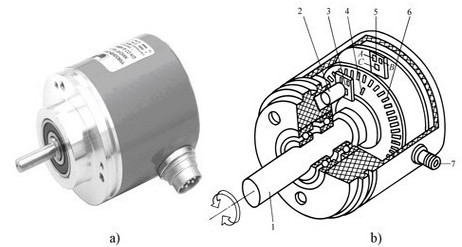 光電編碼器是一種旋轉(zhuǎn)式位置傳感器,在現(xiàn)代伺服系統(tǒng)中廣泛應(yīng)用于角位移或角速率的測量,它的轉(zhuǎn)軸通常與被測旋轉(zhuǎn)軸連接,隨被測軸一起轉(zhuǎn)動。它能將被測軸的角位移轉(zhuǎn)換成二進制編碼或一串脈沖。