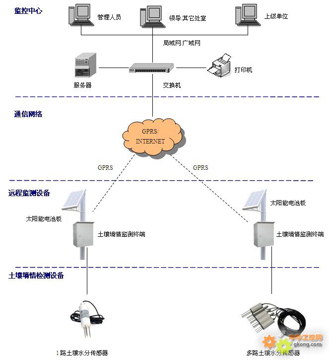 二、 解決方案 1、系統(tǒng)構(gòu)成 土壤墑情監(jiān)測系統(tǒng)主要由監(jiān)控中心、通信網(wǎng)絡(luò)、遠(yuǎn)程監(jiān)測設(shè)備和土壤墑情檢測設(shè)備四部分構(gòu)成。 監(jiān)控中心: 硬件主要由服務(wù)器、計算機(jī)、交換機(jī)、打印機(jī)等組成。 軟件主要有操作系統(tǒng)軟件、數(shù)據(jù)庫軟件、土壤墑情監(jiān)測系統(tǒng)軟件組成。 通信平臺: 包括中國移動GPRS網(wǎng)絡(luò)和INTERNET公網(wǎng)。 系統(tǒng)計劃采用公網(wǎng)專線的組網(wǎng)方式,監(jiān)控中心需具備可上外網(wǎng)的固定IP地址。 遠(yuǎn)程監(jiān)測設(shè)備: 遠(yuǎn)程監(jiān)測設(shè)備可根據(jù)供電類型分為市電供電土壤墑情監(jiān)測終端、太陽能供電土壤墑情監(jiān)測終端和電池供電土壤墑情監(jiān)測終端。 針對土壤墑情監(jiān)測點(diǎn)分散分布、不易布線的特點(diǎn),建議選用太陽能供電型土壤墑情監(jiān)測終端。 土壤墑情檢測設(shè)備: 根據(jù)監(jiān)測需求,可采用1路土壤水分傳感器實現(xiàn)單點(diǎn)墑情檢測;也可采用多路土壤水分傳感器,并將傳感器布置在不同的深度,實現(xiàn)監(jiān)測點(diǎn)的剖面土壤墑情檢測。 2、系統(tǒng)拓?fù)鋱D