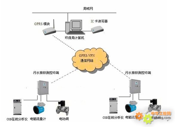 一、客戶需求 環保局和污水處理廠在進行污水排放管理的時候常常遇到以下問題:一是環保管理人員少,巡檢周期比較長,不能隨時掌握各企業污水排放的情況;二是排污費拖欠嚴重,排污單位不積極交納費用。 為了解決上述問題,環保局和污水處理廠需要建立起一套“企業排污流量監控,COD等水質監測系統”。系統建成后,環保局和污水處理廠可以實現兩個目標,第一:在監控中心實時監測所轄各單位的污水排放情況,必要時可遠程關閉排污閥門;第二:改變傳統的收費模式,排污單位需要持IC卡到環保局交費,做到先交費后排污。 系統建設目標: ◆ 實時監測各企業排污口污水COD含量和污水排放量。 ◆ 實時監測電動閥門的開、關狀態。 ◆ 遠程控制電動閥門的開啟和關閉。 ◆ IC卡預付費充值管理,做到先交費后排污,欠費自動停止排污。 ◆ 可設定污水COD上限值,COD監測數據越限時系統可自動停閥,停止排污。 ◆ 遠程監測現場監控設備的安防狀態。 ◆ 利用多樣的圖形展示手段,進行實時、歷史數據的展示,達到直觀、清晰的效果。 ◆ 對采集鏈路、通訊網絡進行診斷,使工作人員可隨時了解系統通訊及數據傳輸狀態。 ◆ 具備實時數據、歷史數據、報警數據的查詢功能;現場設備在網絡中斷、網速過慢時將數據緩存,待恢復后實現斷點續傳,確保數據完整性。 二、解決方案 1、系統組成 污水排放遠程監控系統由監控中心、通信網絡、監控設備、計控設備四部分組成。 監測中心:由計算機、IC卡讀寫器、GPRS數據傳輸模塊、污水排放遠程監控系統軟件組成。 通信網絡:移動公司GPRS-VPN專網;非接觸式IC卡。 監控設備:污水排放測控終端。 計控設備:電磁流量計、COD在線分析儀、電動閥。 2、污水排放遠程監控系統拓撲圖