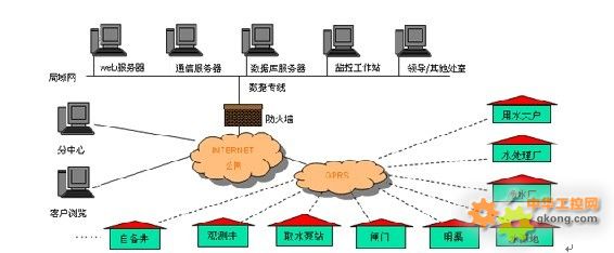 ---系統目標--- 水資源遠程實時監控管理系統適用于水務部門對地下水、地表水的水量、水位和水質進行監測,有助于水務局掌握本區域水資源現狀、水資源使用情況、加強水資源費回收力度、實現對水資源正確評價、合理調度及有效控制的目的。 ---系統組成--- ◆ 監控中心: 主要硬件:服務器、數據專線、路由器等。 主要軟件:操作系統軟件、數據庫軟件、水資源遙測監測系統軟件、防火墻軟件 ◆ 通信網絡:中國移動公司GPRS無線網絡。 ◆ 終端設備:水資源測控終端、無線抄表器。 ◆ 測量設備:水表、流量計、水位計、雨量計、水質計等。 ---系統拓撲圖---