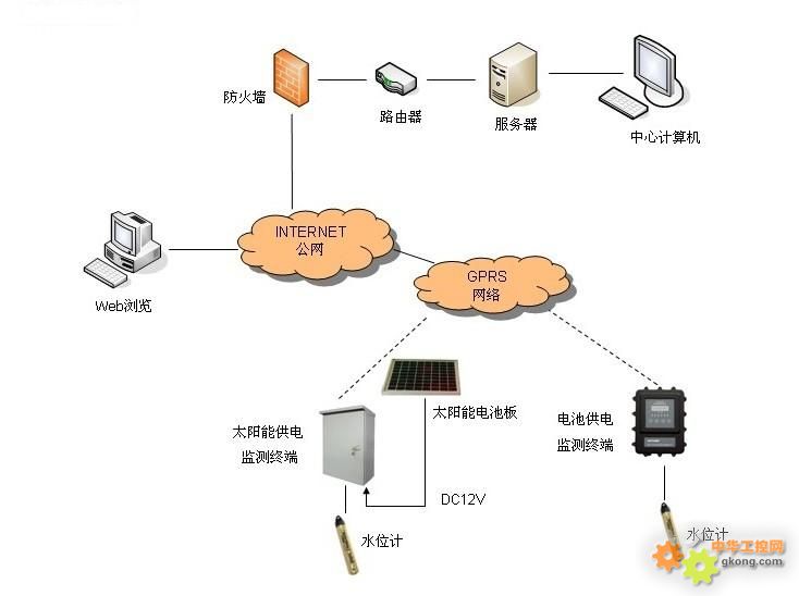 一、概述 地下水資源較地表水資源復雜,因此地下水本身質和量的變化以及引起地下水變化的環境條件和地下水的運移規律不能直接觀察,同時,地下水的污染以及地下水超采引起的地面沉降是緩變型的,一旦積累到一定程度,就成為不可逆的破壞。因此準確開發保護地下水就必須依靠長期的地下水監測,及時掌握動態變化情況。 二、系統解決方案 2.1 系統概述 該系統依托中國移動公司GPRS網絡,工作人員可以在監測中心查看地下水的水位、溫度、電導率的數據。監測中心的監測管理軟件能夠實現數據的遠程采集、遠程監測,監測的所有數據進入數據庫,生成各種報表和曲線。 2.2 系統組成 該系統由四部分組成:監測中心、通信網絡、微功耗測控終端、水位監測記錄儀(水位計)。 2.3 系統拓撲圖  2.4 監測中心 2.4.1 中心軟件系統概述 該軟件是地下水監測系統專用軟件,采用B/S結構,由系統管理員負責管理,領導者或其它工作人員經授權后可在自己的計算機上通過局域網訪問服務器,可進行權利范圍內的操作。如果需要,該軟件可以在INTERNET公網上發布,被授權者在任何地方的計算機上都可以通過INTERNET公網訪問和操作該系統。 該軟件采用模塊結構,主要包括兩大模塊:一個是人機界面、另一個是通訊前置機。每個模塊又由若干小模塊組成。通訊前置機軟件主要負責監控中心與現場設備的通信,它具有強大的兼容性,可支持任何廠家生產的GPRS、CDMA、MODEM、RS485等通信產品,支持多種通信方式共存一個系統。人機界面包括基礎數據管理、遠程操作、人工錄入、數據查詢、數據報表、數據分析、地圖管理等多項內容,可根據不同客戶的不同需求設計組合成個性化的監控與管理系統軟件。 2.4.2 監測中心配置 硬件: 中心具備寬帶網絡(類型:光纖、網線、ADSL等),并綁定固定IP。 一臺專用計算機,放在機房,作為固定IP服務器,將服務器操作系統和數據庫軟件和系統監控軟件裝在里面,存貯數據,保證其24小時在線。 軟件: 操作系統軟件:推薦Windows 2003 Server with sp2 數據庫軟件:推薦Microsoft SQL Server 2000 SP4,作為系統后臺數據庫的軟件平臺。 地下水監測系統軟件:完成遠程數據的接收、顯示、存儲和統計分析等功能。 2.4.3、地下水監測管理系統軟件功能介紹 ◆ 軟件主界面 開機界面顯示地圖,地圖上每個地下水監測點的位置以圓點顯示,紅色代表故障,綠色代表正常,鼠標放置圓點位置時,顯示該測點的水位、水溫等數據。