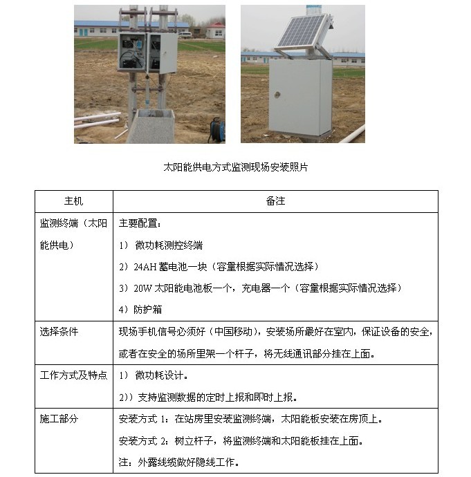 2.6.2太陽能電源供電方案 適用于使用太陽能作為供電電源的監測現場,太陽能電源分為三部分,太陽能電池板、太陽能充電控制器、鉛酸蓄電池。根據現場用電設備(包含微功耗測控終端與現場采集設備)的功率來選擇光電池板的大小與蓄電池的容量。 下面為計算方法。 太陽能板配制計算方法: 電池板配置功率(W)= 設備功耗(W)×每天工作時間(小時)×1.2(安全系數)÷[5小時(每天有效工作時間) ×0.6(充電效率)] 蓄電池配置計算方法:蓄電池配置容量(Ah)= 設備功耗(W)×每天工作時間(小時)× 陰雨天(天數)÷[設備供電電壓(V) ×0.6(供電效率)]