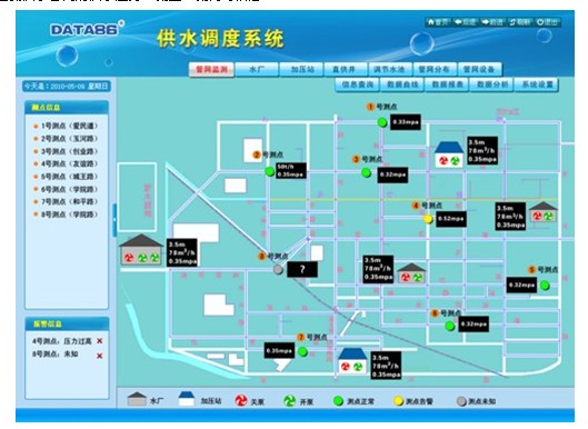 ◆ 遠程告警 當水位超限、壓力超限、電流異常、水泵保護、現場斷電、人員闖入等狀況發生時,系統立即提示報警信息。 ◆ 遠程控制 具備操作權限的管理人員可遠程控制水源井、取水泵站、水廠、加壓泵站等監測點泵組、閥門等設備的啟停。 ◆ 自動控制 系統可自動控制現場設備的運行,并可遠程切換控制模式。舉例如下: 1)根據水源井水位自動控制水源井水泵的啟停。 2)根據取水點水位自動控制取水泵組的啟停。 3)根據蓄水池水位或出水管網壓力自動控制水廠/加壓泵站內加壓泵組的啟停。 3、供水調度管理 ◆ 管網數據監測 1)實時監測水廠出水流量和壓力。 2)實時監測中途加壓泵站/小區加壓泵站的進站壓力或蓄水池水位、泵站出水壓力和流量、泵組運行狀態和運行參數。 3)遠程監測供水管網的供水壓力、流量、流向等信息。