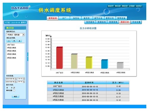 4)遠程監測各區域用水總量和用水大戶的用水量信息。 ◆ 數據統計分析 1)數據查詢:支持各種監測信息、控制信息、報警信息、操作信息的存儲和查詢,支持數據導出和打印功能。 2)統計與分析:自動生成制水、供水各生產環節的匯總報表和統計報表;自動生成各項生產數據的歷史曲線、柱狀圖、餅圖等分析圖表。