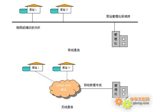 ---適用范圍--- 污水輸送泵站遠程監控、自動化控制系統適用于城市排水泵站的遠程監控及管理。泵站管理人員可以在泵站管理處的監控中心遠程監測站內格柵機的工作狀態、污水池水位、提升泵組工作狀態、出站流量、池內有害氣體濃度等;支持手動控制、自動控制、遠程控制格柵機、排風機及提升泵的啟停;圖像監視站內全景及重要的工位。 ---系統組成--- 污水輸送泵站遠程監控、自動化控制系統主要由監控中心、通信平臺、泵站遠程測控終端、計量測量及攝像設備組成。 ---通信平臺--- 通信平臺常用兩種,一是有線通信:每個加壓泵站與管理處之間租用光纖通信,調度中心、泵站監控中心、各職能部門之間通過局域網通信,該通信平臺可傳輸連續圖像。二是無線通信:每個加壓泵站與調度中心之間通過GPRS無線網絡通信,調度中心、泵站監控中心、各職能部門之間通過局域網通信,該通信平臺不能傳輸連續圖像。