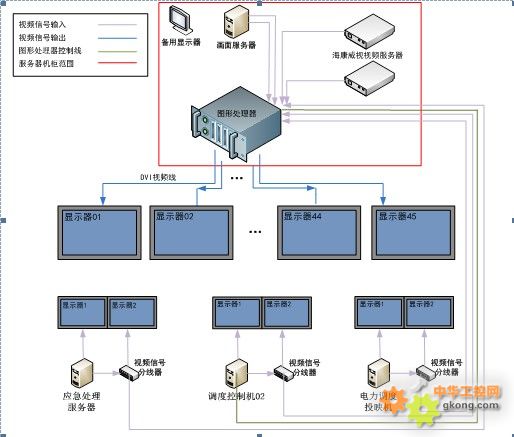 本系統顯示屏幕采用三星提供的拼接屏和圖形處理器,并通過海康威視的視頻服務器將廠內的視頻監控信號進行集成。統一在生產指揮調度中心的大屏幕上進行顯示。現場硬件布局如下: