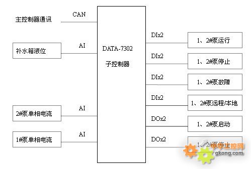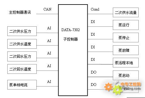 4.2 監控終端系統構成描述 監控終端系統主要由值班室監控終端柜和深井泵監控終端箱組成。 值班室監控終端中DATA-7301主要負責上、下通訊和一次回路設備數據的采集和執行,有6個通訊端口,12路DI通道,6路AI通道,6路DO通道。通過RJ45端口與換熱站監控中心通訊;通過COM1 端口和GPRS發射模塊相連,經GPRS網絡與公司調度中心進行傳輸數據;通過COM2采集總電源智能電表和一次供熱流量計輸出的串口數據;通過COM3端口經通訊轉換器,將通訊數據輸出轉換成模擬量輸出4-20mA,控制執行器;通過CAN端口與子控制器DATA-7302的CAN端口相連組網。由模擬量AI通道采集一次供回水溫度、壓力、調節閥開度。 值班室監控終端中DATA-7302構成DATA-7301的子網,主要用于循環泵、補水泵、二次回路參數數據的采集和執行。有3個通訊端口,CAN端口用于對上組網通訊,COM1用于對現場串口設備數據采集如流量;還有20路DI通道,8路AI通道,8路DO通道。 深井泵監控終端箱中DATA-7302構成DATA-7301的子網,主要用于2臺深井泵的數據采集和控制并可以由補水箱液位參與構成閉環控制。 4.3 值班室監控終端DATA-7302功能框圖