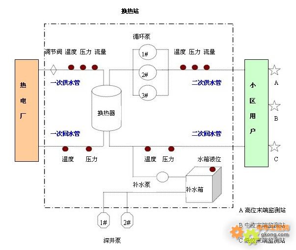 一、項(xiàng)目概況與需求: 某換熱站原有一套PLC監(jiān)控系統(tǒng),但目前系統(tǒng)已故障,無(wú)法繼續(xù)使用。供熱公司欲建立一套新的無(wú)人值守?fù)Q熱站集中供熱監(jiān)控,以恢復(fù)換熱站的監(jiān)控功能并升級(jí)實(shí)現(xiàn)供熱公司對(duì)所屬各換熱站的全面遠(yuǎn)程監(jiān)控。 1.1 工藝流程示意圖: