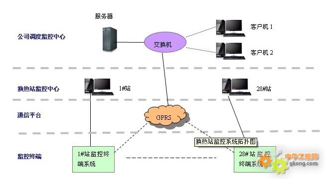 1.3 公司調(diào)度和換熱站監(jiān)控中心要求: (1)各換熱站的數(shù)據(jù)通過(guò)移動(dòng)公司GPRS網(wǎng)絡(luò)平臺(tái)傳輸,采用雙向穩(wěn)定的TCP協(xié)議,把數(shù)據(jù)傳輸?shù)奖O(jiān)測(cè)中心的有固定IP的服務(wù)器里。中心軟件平臺(tái)還可對(duì)各監(jiān)測(cè)數(shù)據(jù)進(jìn)行分析、存儲(chǔ)、預(yù)警與管理,以及設(shè)備運(yùn)維信息的建檔管理 (2)在每個(gè)換熱站設(shè)立本站監(jiān)控中心,監(jiān)測(cè)畫(huà)面為供熱生產(chǎn)工藝流程圖,以動(dòng)畫(huà)的形式表達(dá),畫(huà)面簡(jiǎn)單,方便工人操作。 二、系統(tǒng)解決方案 2.1 總體設(shè)計(jì)思路 根據(jù)客戶需求和現(xiàn)場(chǎng)情況,換熱站監(jiān)控系統(tǒng)整體分為三大部分: 2.1.1 公司調(diào)度總監(jiān)控中心 現(xiàn)場(chǎng)設(shè)備運(yùn)行數(shù)據(jù)經(jīng)現(xiàn)場(chǎng)監(jiān)控終端及其通訊端口,通過(guò)GPRS傳輸模塊和GPRS網(wǎng)絡(luò)平臺(tái)傳輸?shù)絀NTETNET網(wǎng),進(jìn)入到有固定IP地址的服務(wù)器里,把現(xiàn)場(chǎng)28個(gè)換熱站的各類(lèi)數(shù)據(jù)進(jìn)行采集進(jìn)入中心服務(wù)器,各職能工作人員通過(guò)客戶計(jì)算機(jī)訪問(wèn)服務(wù)器數(shù)據(jù),實(shí)時(shí)了解各監(jiān)測(cè)站點(diǎn)的設(shè)備運(yùn)行情況、相關(guān)運(yùn)行參數(shù)。監(jiān)控中心發(fā)送的命令也由此路徑執(zhí)行到受控設(shè)備。 2.1.2 換熱站監(jiān)控分中心 設(shè)立在每個(gè)換熱站值班室內(nèi),現(xiàn)場(chǎng)監(jiān)控終端數(shù)據(jù)通過(guò)有線的方式經(jīng)其RJ45通訊端口傳輸?shù)奖O(jiān)控計(jì)算機(jī)內(nèi)。站內(nèi)的工作人員可以通過(guò)計(jì)算機(jī)界面,實(shí)現(xiàn)對(duì)現(xiàn)場(chǎng)各種設(shè)備操作的功能。 2.1.3 現(xiàn)場(chǎng)監(jiān)控終端系統(tǒng) 主要由我公司研發(fā)生產(chǎn)的DATA86控制器系列產(chǎn)品組成,負(fù)責(zé)采集現(xiàn)場(chǎng)數(shù)據(jù),并將數(shù)據(jù)通過(guò)相應(yīng)的通訊端口上傳,同時(shí)執(zhí)行各級(jí)中心下達(dá)的命令。 2.2 換熱站監(jiān)控系統(tǒng)拓?fù)鋱D